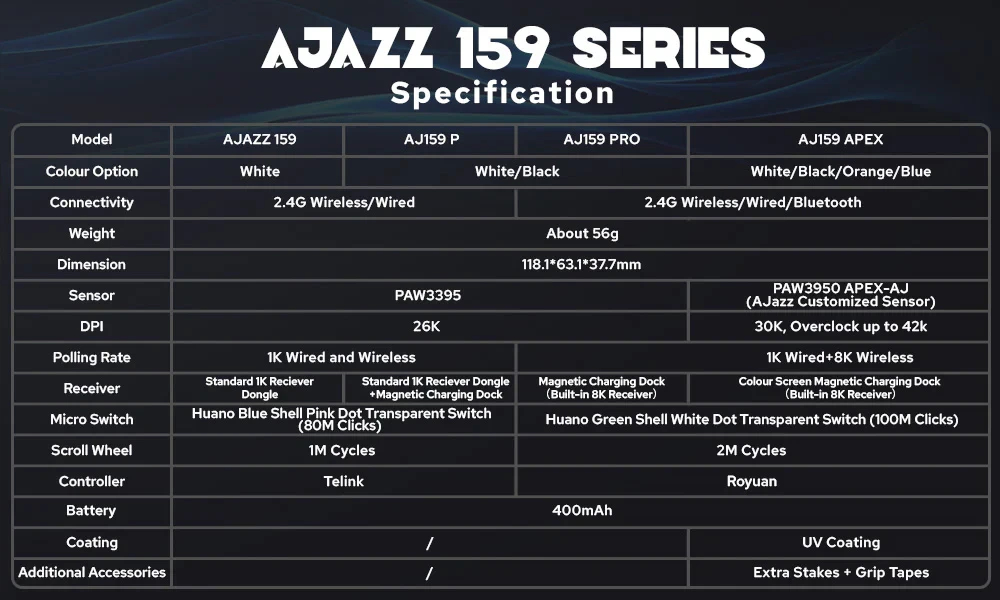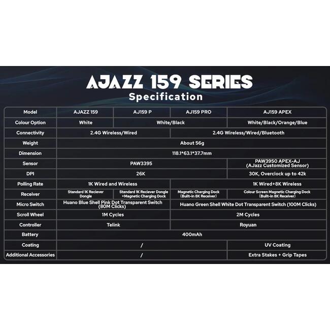 | ДОПЪЛНИТЕЛНИ | Magnetic Charging Base with Customizable Display Triple Modes Connection & High Polling Reate Efficient 400mAh Battery with Low-Power Consumption AJ159 APEX can be overclocked to 42,000 DPI, alongside a tracking speed of 750 IPS and 50G acceleration 100 Million Clicks Micro Switch |
