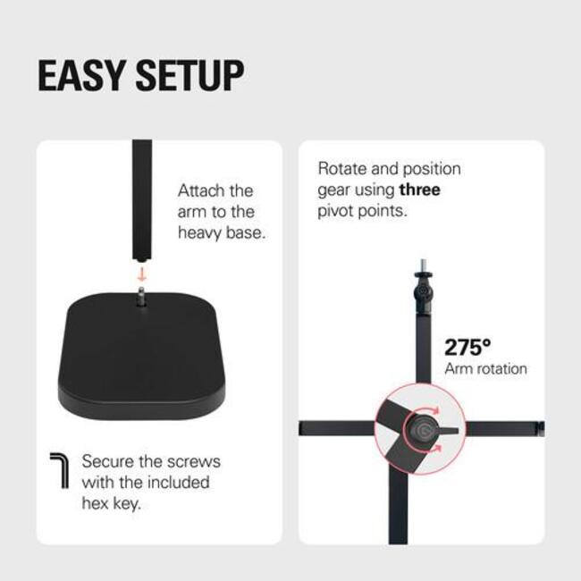 Elgato Wave Desk Stand е компактен, изключително гъвкав и премиум метален настолен стойка, създадена да позиционира микрофони, камери и малки аксесоари с прецизност, като същевременно поддържа работното пространство подредено и професионално. Тя предлага отлична стабилност благодарение на тежката основа и поддържа устройства до 1 кг, което я прави идеална за създатели, които искат елегантна алтернатива на бум рамото.