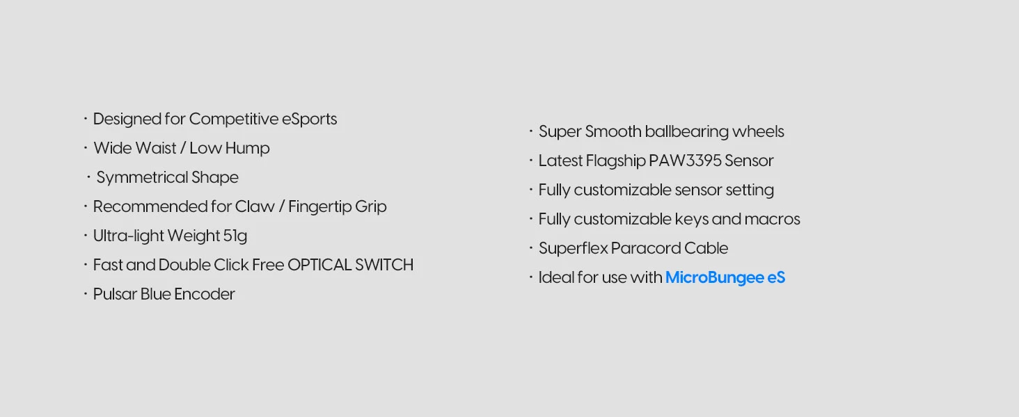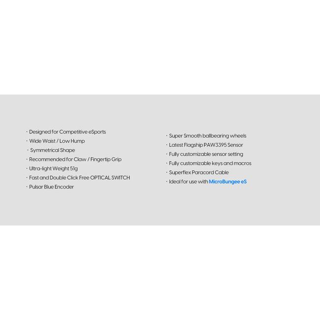 | ДОПЪЛНИТЕЛНИ | Designed for Competitive eSports Wide Waist / Low Hump Symmetrical Shape Recommended for Claw / Fingertip Grip Pulsar Blue Encoder Super Smooth ballbearing wheels Latest Flagship PAW3395 Sensor Fully customizable keys and macros Ideal for use with MicroBungee eS |