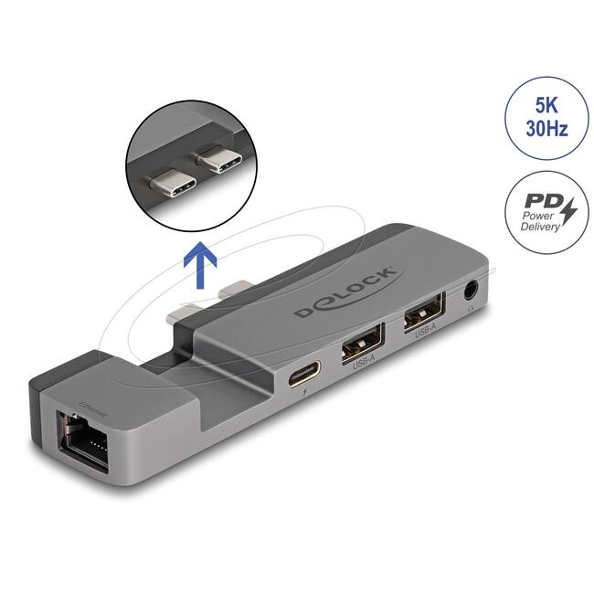 Delock 87757 е компактна, мощна докинг станция, специално проектирана за MacBook Pro и MacBook Air, които имат два съседни Thunderbolt 4 порта. Тя комбинира функции за видео, данни, мрежа и зареждане, така че лаптопът ти да стане истински център за периферни устройства и дисплеи.