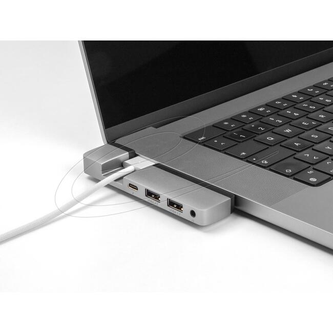Проектиран с отвърстие (gap), за да позволява използването на MagSafe 3 зарядно устройство, докато докинг станцията е монтирана на MacBook-а