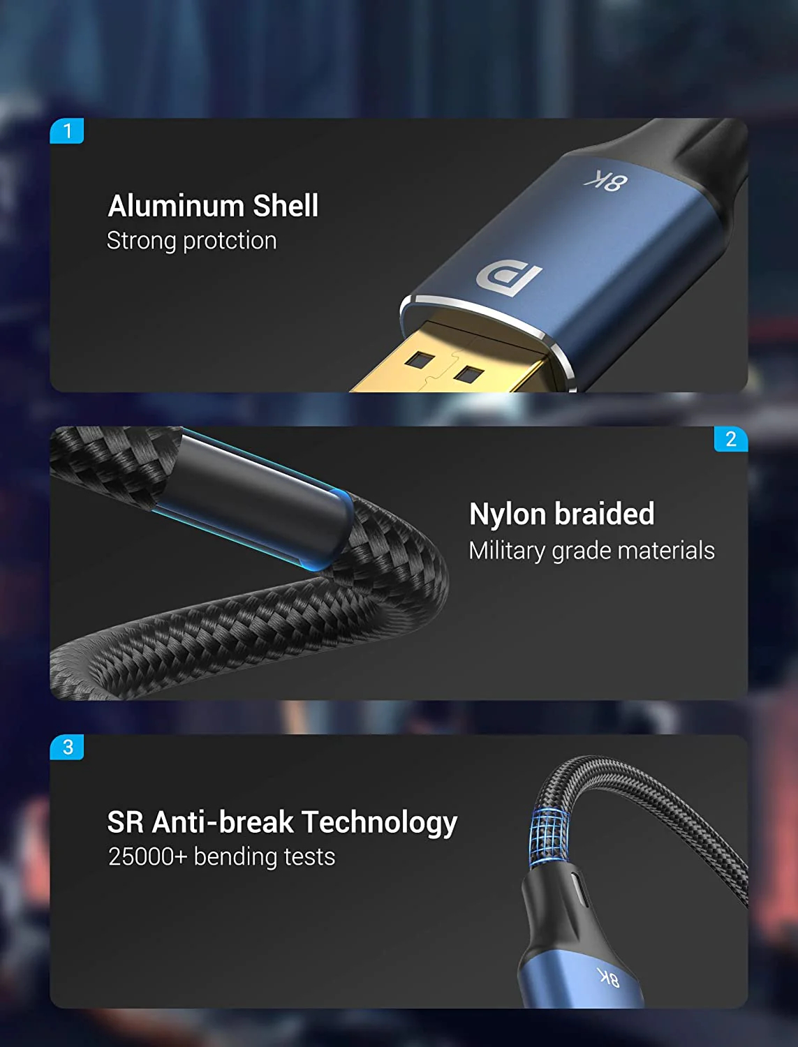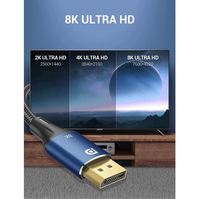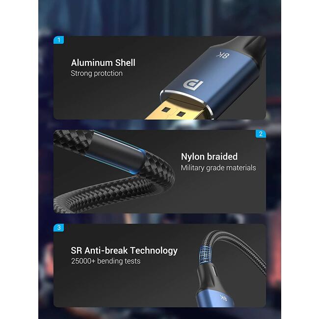 | ДОПЪЛНИТЕЛНИ | Refresh Rate: 8K@60Hz, 4K@144Hz, 2K@165Hz, 1080p@240Hz Support 3D, FreeSync and G-Sync; HBR3,HDCP2.2/CEC/EDID,24K Gold plated Connector Cotton Braid Blue Aluminium Shell |