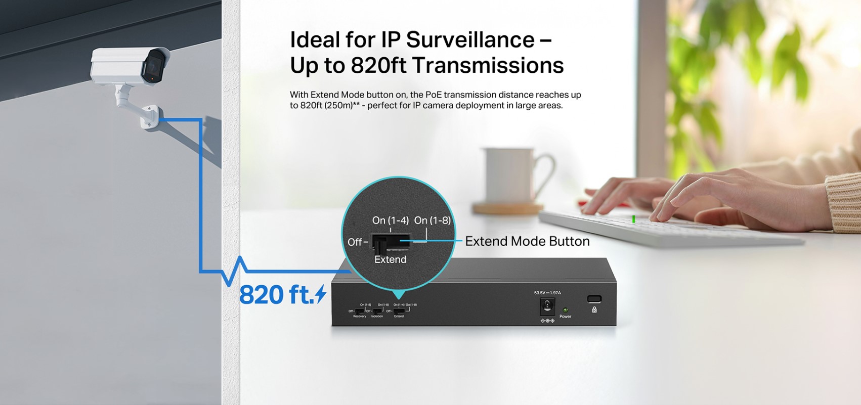 При активиран Extend Mode, PoE разстоянието за пренос достига до 820 фута (250 м), което го прави идеален за внедряване на IP камери в големи пространства.