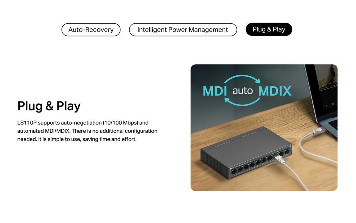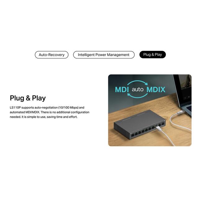 LS110P поддържа автоматично договаряне (10/100 Mbps) и автоматичен MDI/MDIX. Не е необходима допълнителна конфигурация – използването е лесно и пести време и усилия.