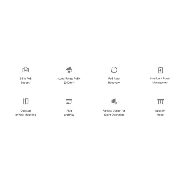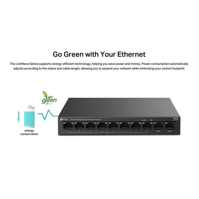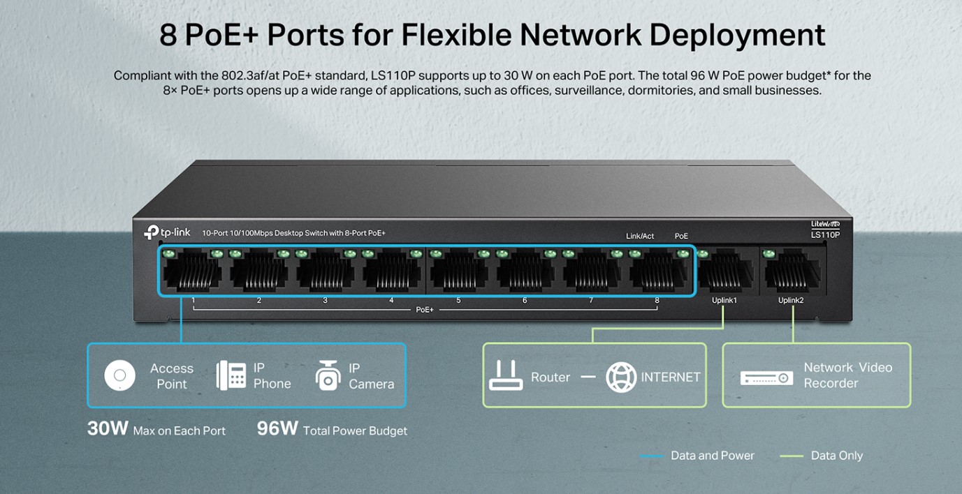 Съвместим със стандарта 802.3af/at PoE+, LS110P поддържа до 30 W на всеки PoE порт. Общият PoE бюджет от 96 W за 8-те PoE+ порта отваря широк спектър от приложения – офиси, видеонаблюдение, общежития и малки бизнеси.