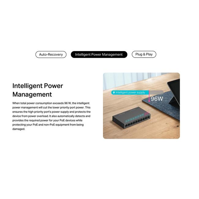 Когато общата консумация на енергия надвиши 96 W, интелигентното управление на захранването автоматично изключва портовете с по-нисък приоритет. Това гарантира стабилно захранване за портовете с висок приоритет и предпазва устройството от претоварване. Системата автоматично открива и осигурява необходимата мощност за PoE устройствата, като същевременно защитава PoE и non-PoE оборудването от повреди.