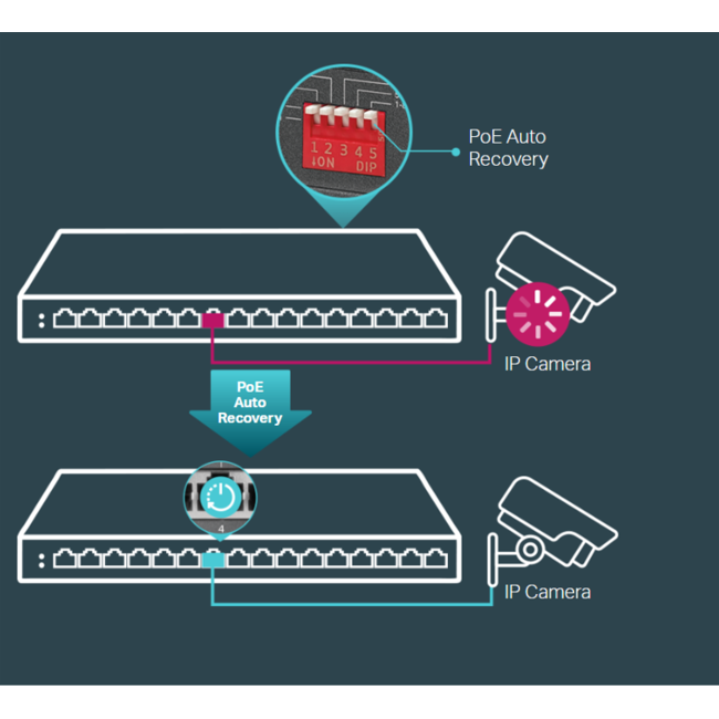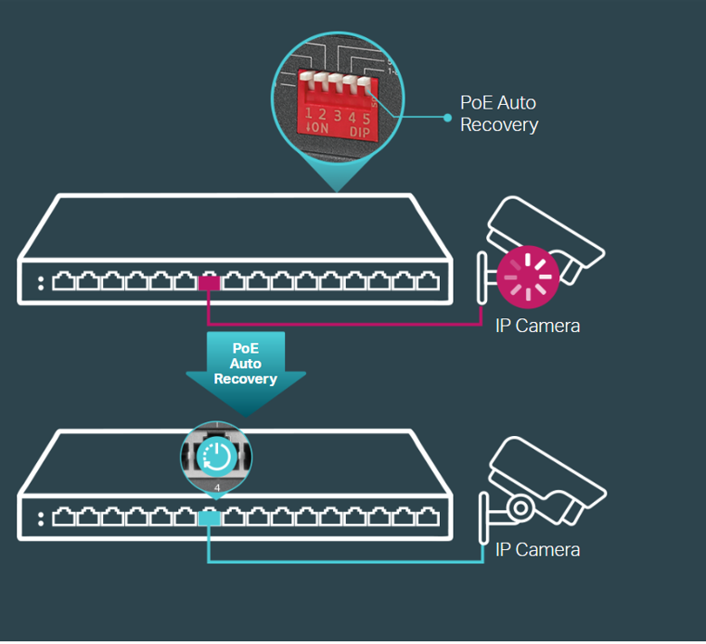 Превключвателят автоматично открива и рестартира PD устройствата, като камери и точки за достъп, когато изпаднат офлайн или престанат да реагират, гарантирайки стабилна работа на устройствата, свързани с PoE, без необходимост от ръчно наблюдение и рестартиране.