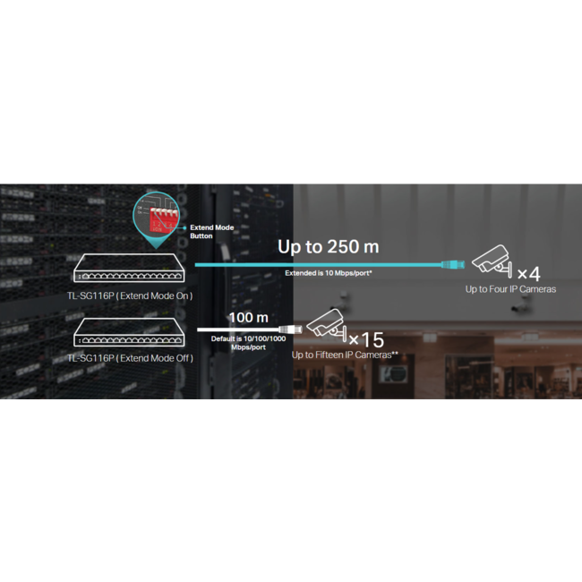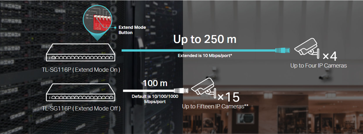 С режим на разширение разстоянието на предаване на PoE достига до 250 м*—перфектно за разполагане на IP камера в големи райони.