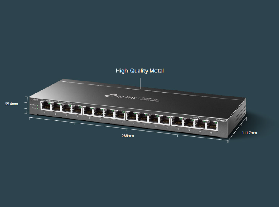 Вътрешните компоненти на TL-SG116P са защитени от висококачествен метален корпус, за да се осигури дълъг живот на продукта. След като е преминал набор от строги тестове за надеждност, TL-SG116P осигурява производителност на превключване, на която можете да разчитате.