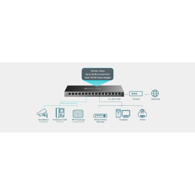 Съответствието със стандарта 802.3af/at PoE+ поддържа до 30W на всеки PoE порт. Общият бюджет от 120W PoE мощност за 16× PoE+ портовете отваря широка гама от приложения, като например наблюдение за офиси, общежития и малки предприятия. Той е напълно съвместим с IP камери, точки за достъп, IP телефони, компютри, принтери и др.