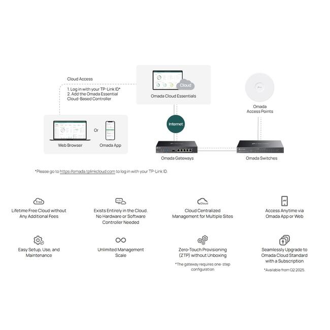 Omada Cloud Essentials е безплатна, лесна за използване версия на облачния контролер Omada. Той осигурява облачно базирано централизирано управление и мониторинг за мрежовата система Omada, обхващайки точки за достъп, комутатори и шлюзове, идеални за мрежи за наблюдение и малки предприятия.