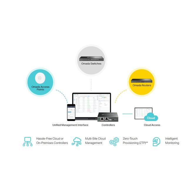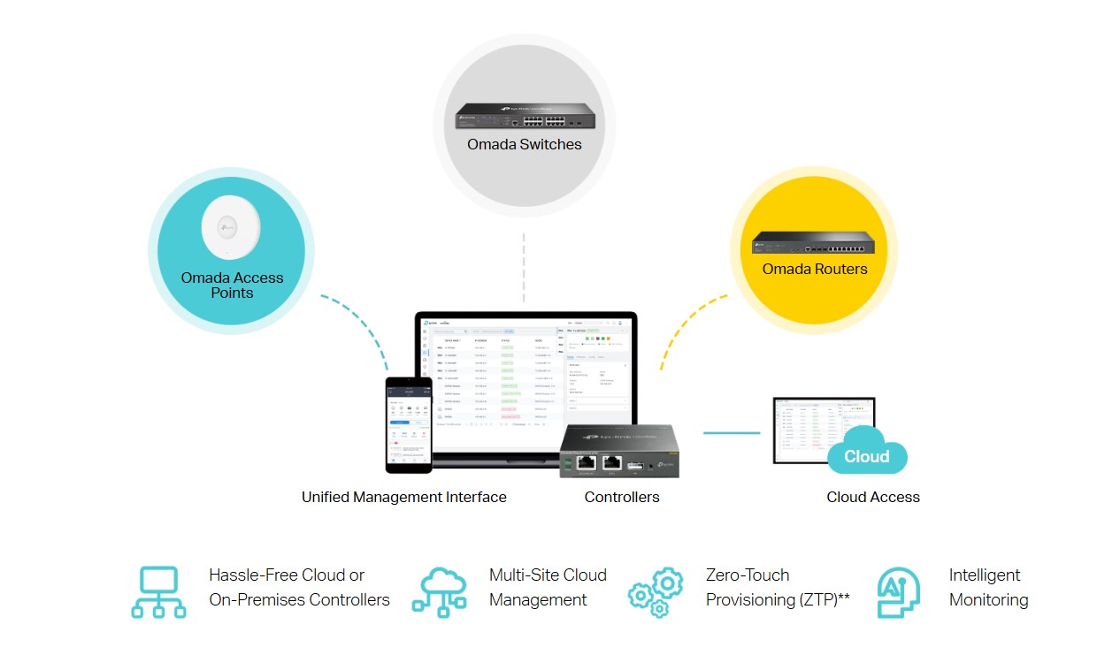 Софтуерно дефинираната мрежа (SDN) на Omada интегрира мрежови устройства, включително точки за достъп, комутатори и шлюзове, осигурявайки 100% централизирано управление на облака. Omada създава силно мащабируема мрежа - всичко това се контролира от един интерфейс. Осигурени са безпроблемни безжични и кабелни връзки, идеални за използване в хотелиерство, образование, търговия на дребно, офиси и др.