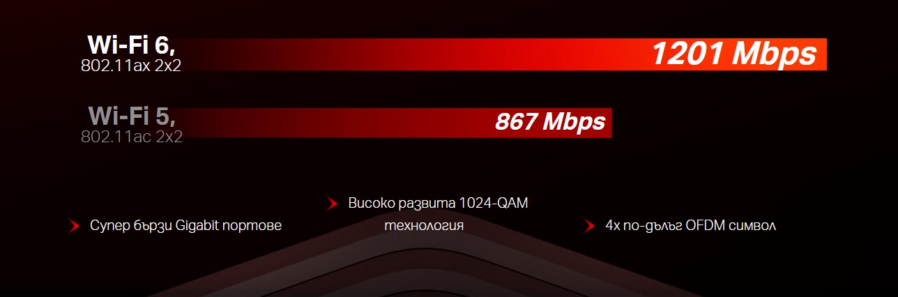 Най-новият стандарт Wi-Fi 6 прилага усъвършенствана технология, предназначена да осигури повече едновременни стабилни връзки, да разшири Wi-Fi обхвата и да поддържа надеждно и бързо предаване на данни, задоволявайки нуждите от високопроизводителна безжична работа.