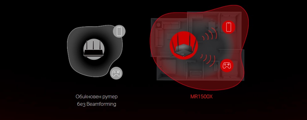 Четири мощни антени с голямо усилване, въоръжени с модерна безжична технология, осигуряват силен сигнал в целия дом. Beamforming открива вашите свързани устройства и концентрира силата на безжичния сигнал към тях, което прави връзките по-стабилни.