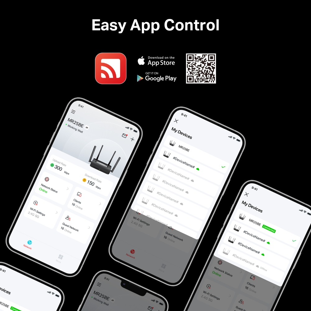 MR25BE е съвместим с EasyMesh, което ви позволява да настроите цяла домашна мрежова мрежа с едно WiFi име и парола с всякакви други точки за достъп, които поддържат EasyMesh от множество доставчици. Насладете се на гъвкав, мащабируем и безпроблемен мрежов WiFi в целия ви дом!
