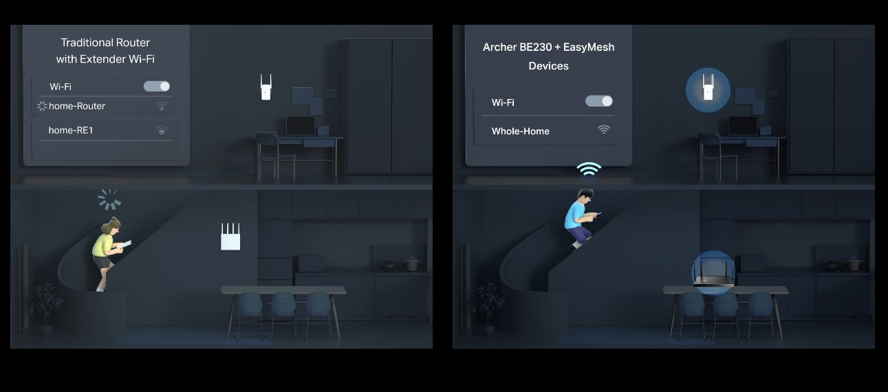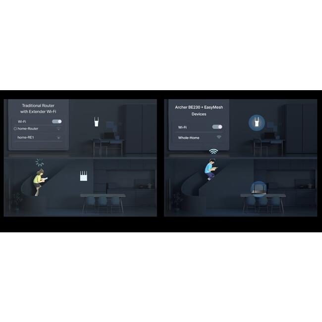 Archer BE230 е съвместим с EasyMesh. Ако имате райони без сигнал у дома, просто добавете друг съвместим с EasyMesh рутер/разширител на обхват или всяко TP-Link устройство, което поддържа OneMesh, за да създадете мулти-гигабитова Mesh Wi-Fi мрежа.