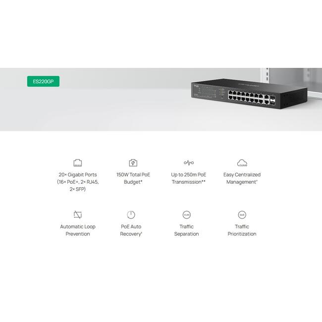 20× гигабитови порта (16× PoE+, 2× RJ45, 2× SFP)
