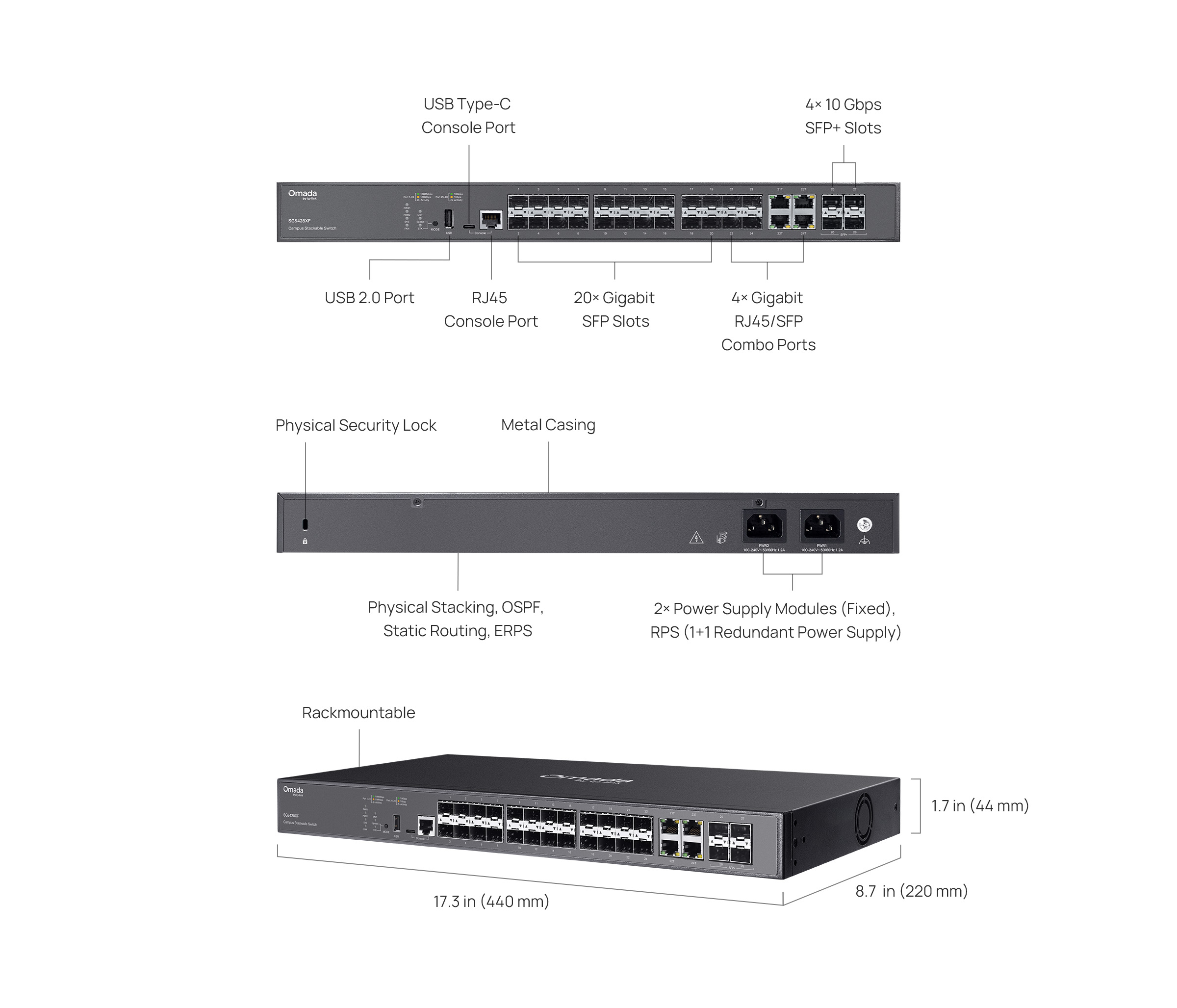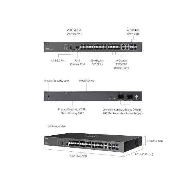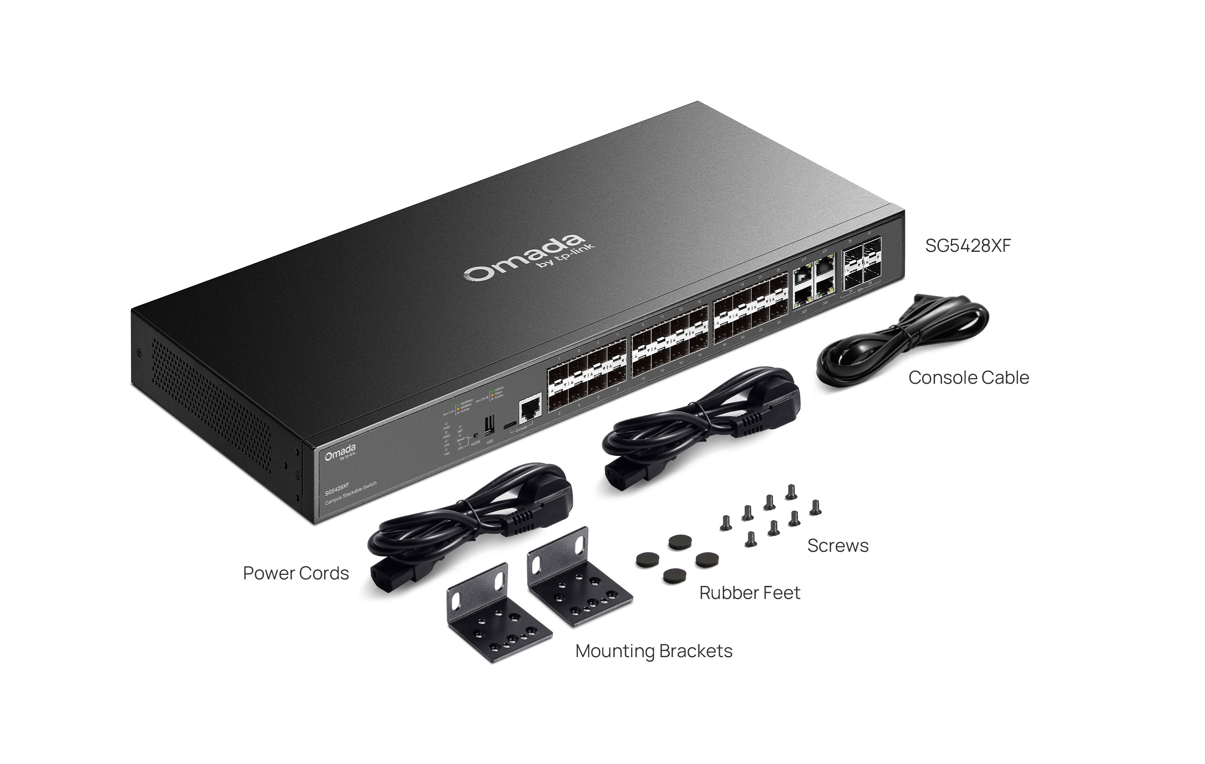 Omada SG5428XF е надежден L3 комутатор от начално ниво, пригоден за агрегационния слой, с L3 маршрутизиране, бърза 10 Gbps кабелна връзка скорости и опции за подреждане. Включва 20× гигабитови SFP слота, 4× гигабитови RJ45/SFP комбинирани порта, 4× 10 Gbps SFP+ слота, възможност за физическо подреждане и централизирано управление. Интегриран със силна сигурност и обширни функции за управление, SG5428XF предлага надеждно мрежово решение за малки и средни предприятия и интернет доставчици.