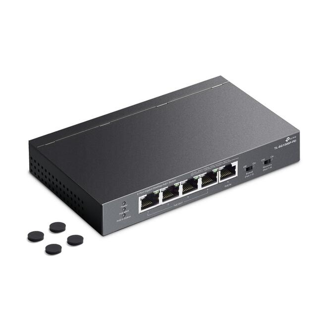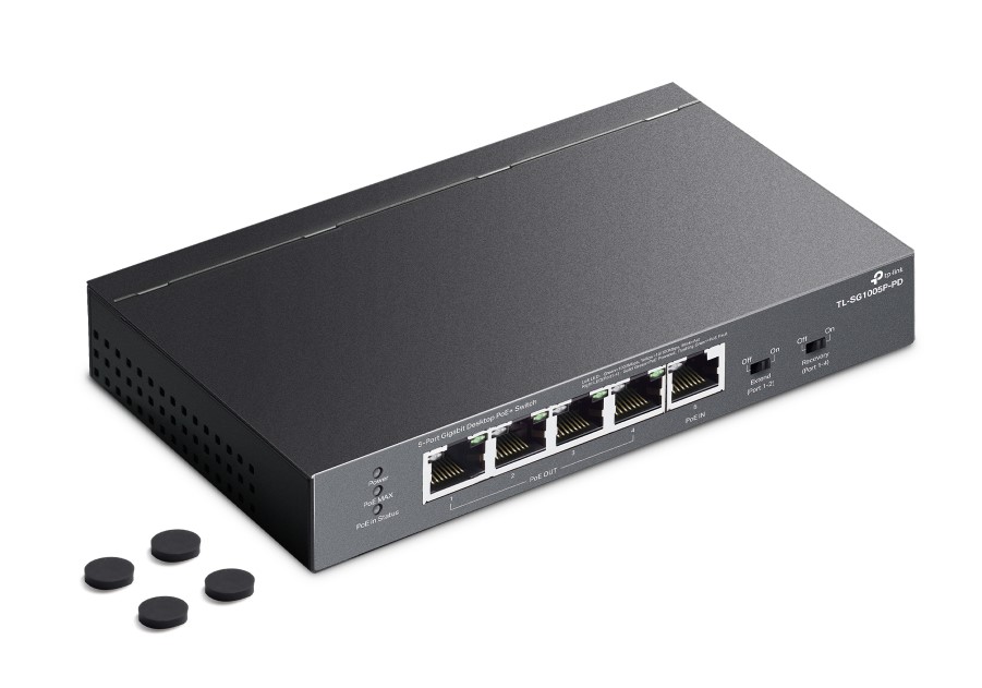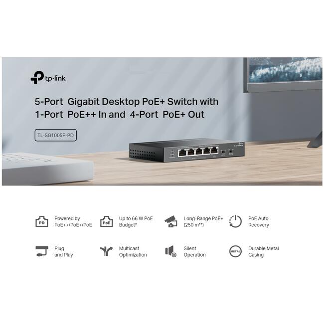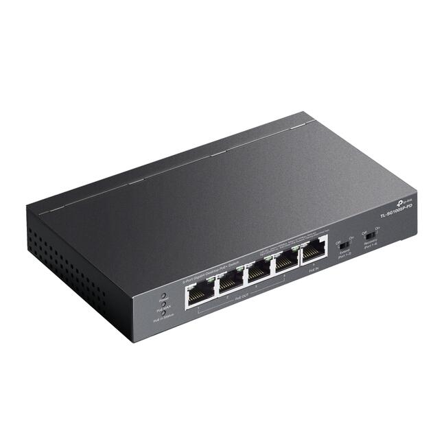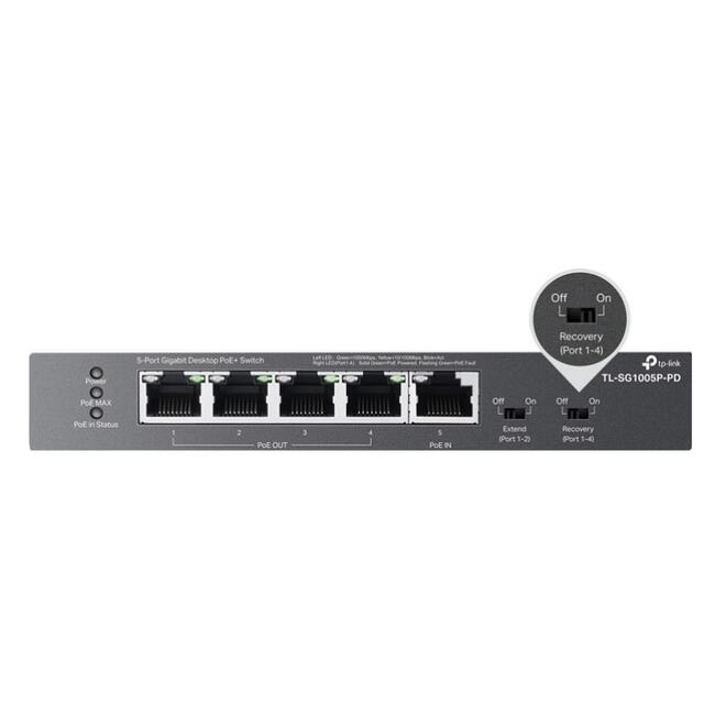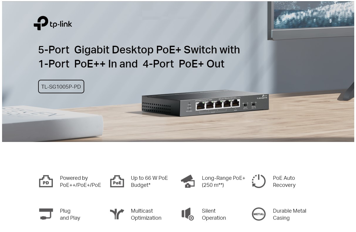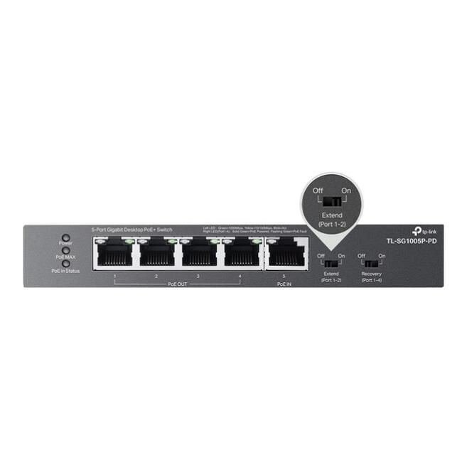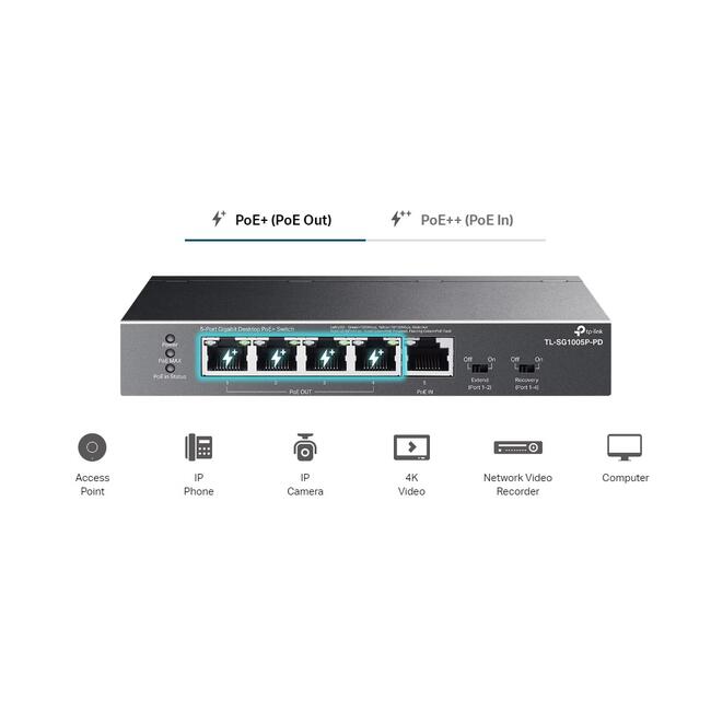 Поддържа до 66W/47W/21W/9W PoE бюджетен изход, когато се захранва съответно от 802.3bt тип 4 (90 W), 802.3bt тип 3 (60 W), 802.3at и 802.3af PoE, съответно.* Превключвателят PoE-PD автоматично открива необходимото PoE захранване за вашите устройства и предпазва вашето оборудване без PoE от повреда.