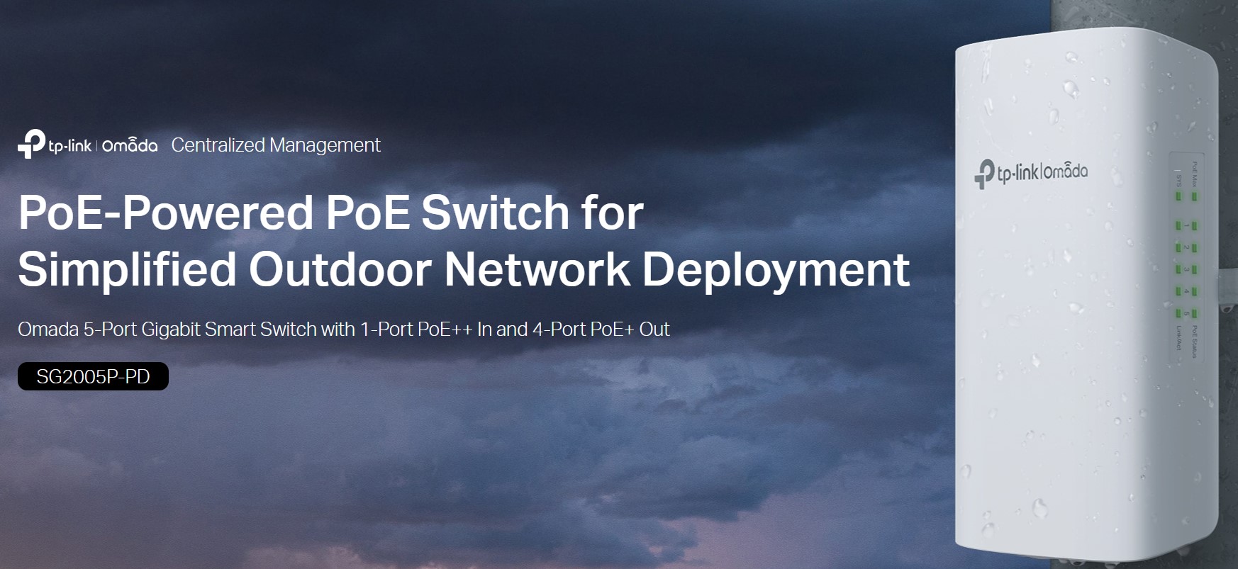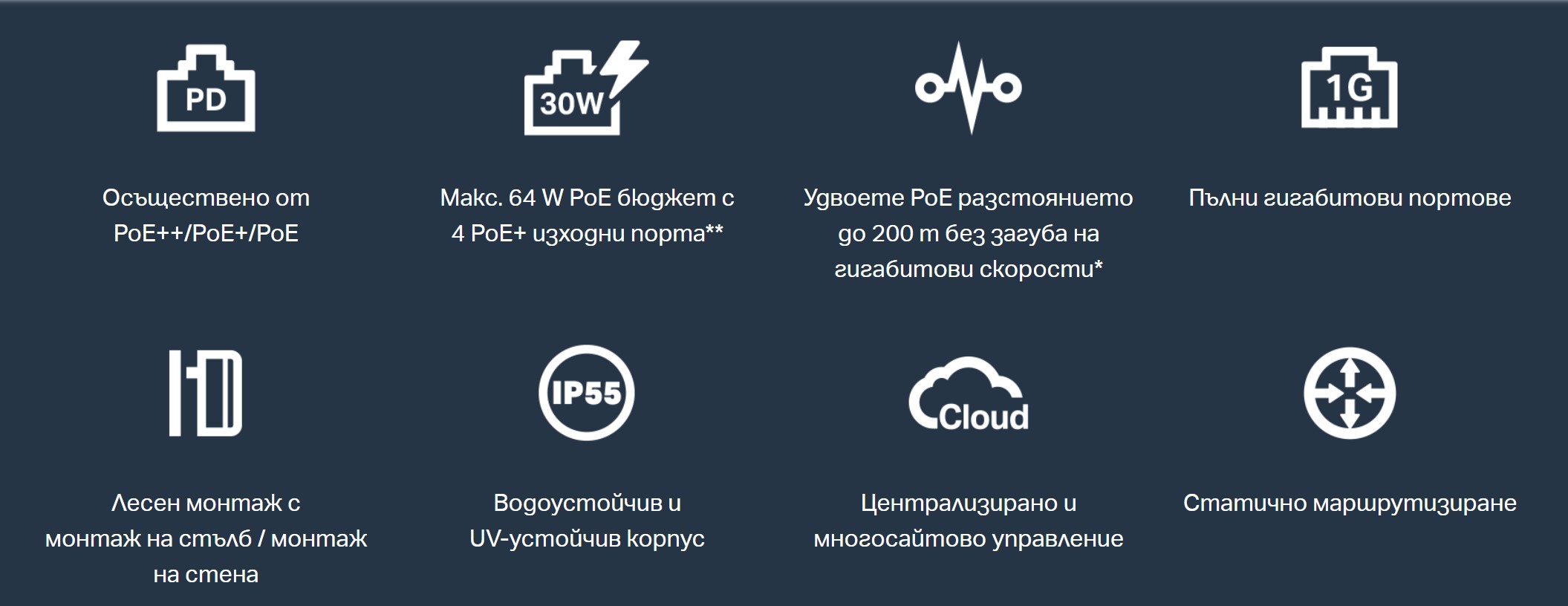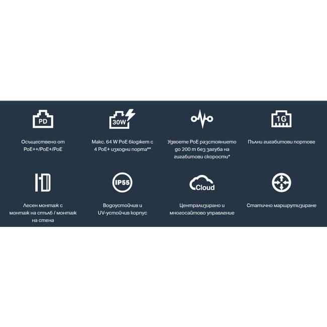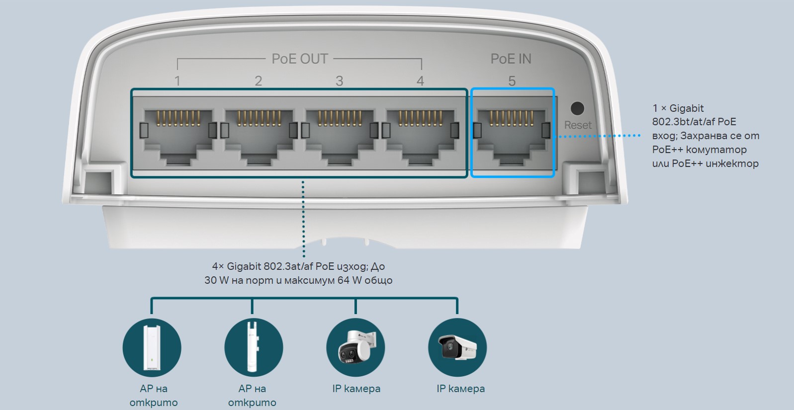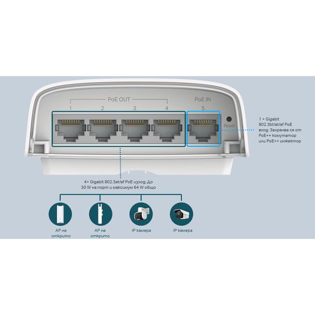 Един Gigabit PoE++ входящ порт и четири Gigabit PoE+ изходни порта