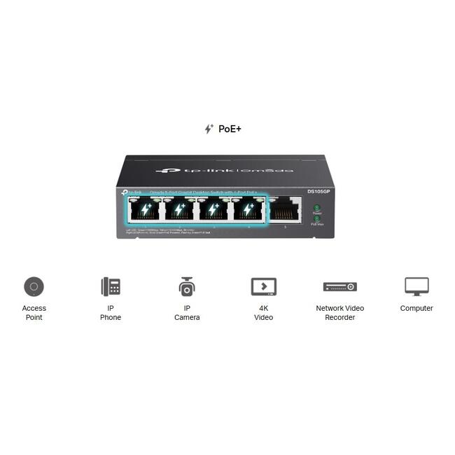 Съвместим със стандартите IEEE 802.3af/at PoE, комутаторът поддържа общ бюджет на PoE мощност от 65 W с 30 W максимум