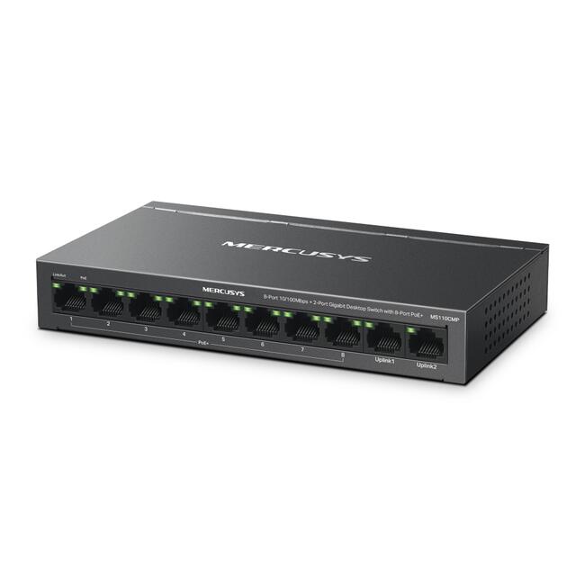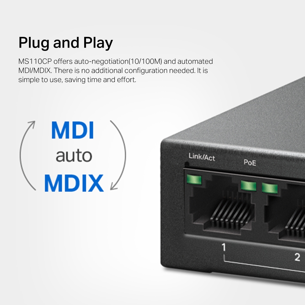 Съвместим със стандарт IEEE 802.3af/at Powered Devices, като всеки от 8-те PoE+ порта поддържа максимално захранване до 30 W. Двата Gigabit non-PoE порта са предназначени за uplink устройства, като единият се използва за връзка с интернет, а другият за връзка с NVR. Общият PoE power budget от 65 W* може да се използва в различни сценарии, включително видеонаблюдение, офиси, общежития и малък бизнес, тъй като MS110CP е съвместим с устройства като IP камери, access points, IP телефони, компютри, видеорекордери и други.