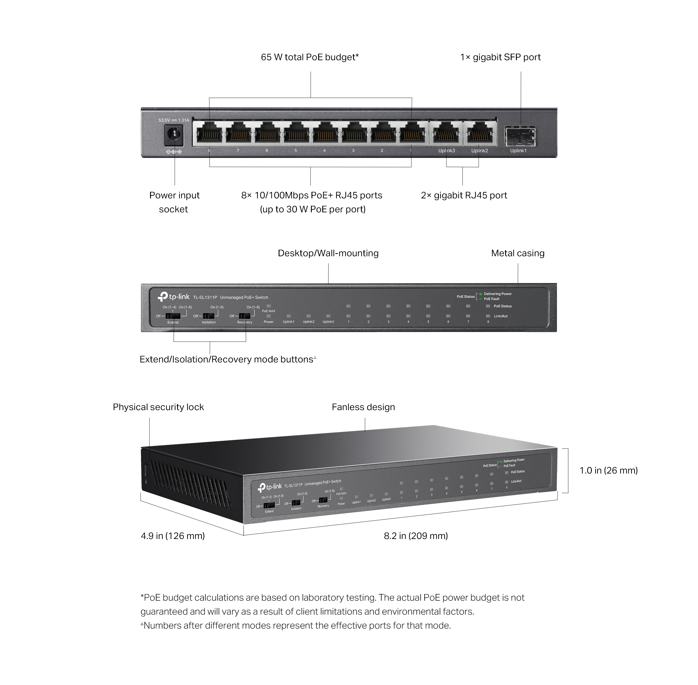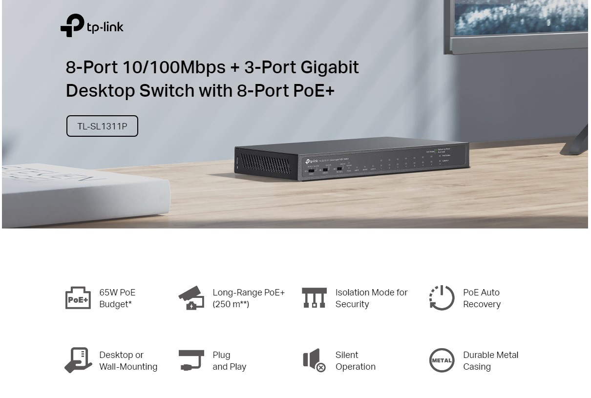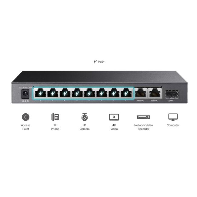 | Интерфейс | 8× 10/100 Mbps 802.3af/at PoE+ Ports, 2× Gigabit RJ45 Ports, 1× Gigabit SFP Port |