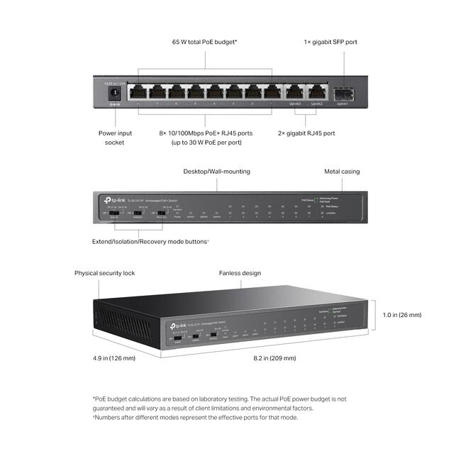 Съвместим със стандартите IEEE 802.3af/at PoE, комутаторът поддържа общ бюджет на PoE мощност от 65 W с 30 W максимум на PoE+ порт. Когато общата консумация на енергия надвиши 65 W, интелигентното управление на мощността ще намали мощността на портовете с по-нисък приоритет, за да защити устройствата от повреда.