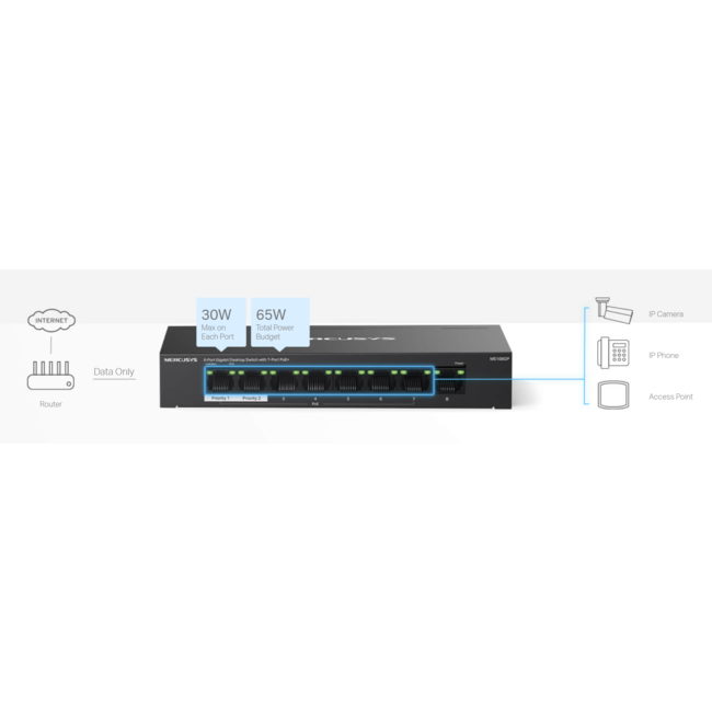 Всички осем порта на MS108GP са гигабитови, като седем от тях са PoE+ портове (1-7). Всеки PoE+ порт поддържа максимална мощност от 30W и е съвместим с устройства по стандартите 802.3af/at. Общият PoE бюджет от 65W* позволява разнообразни приложения, включително видеонаблюдение за офиси, общежития и малки предприятия. IP камери, достъпни точки, IP телефони, компютри, видеорекордери и други са напълно съвместими с него.