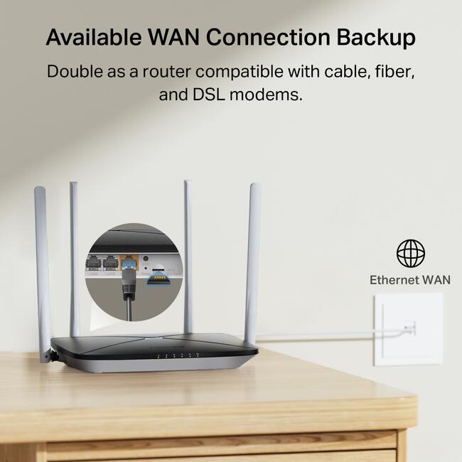 Оборудван с универсален LAN/WAN порт, MB235-4G служи и като рутер, съвместим с кабелни, оптични и DSL модеми, осигурявайки непрекъсната свързаност.