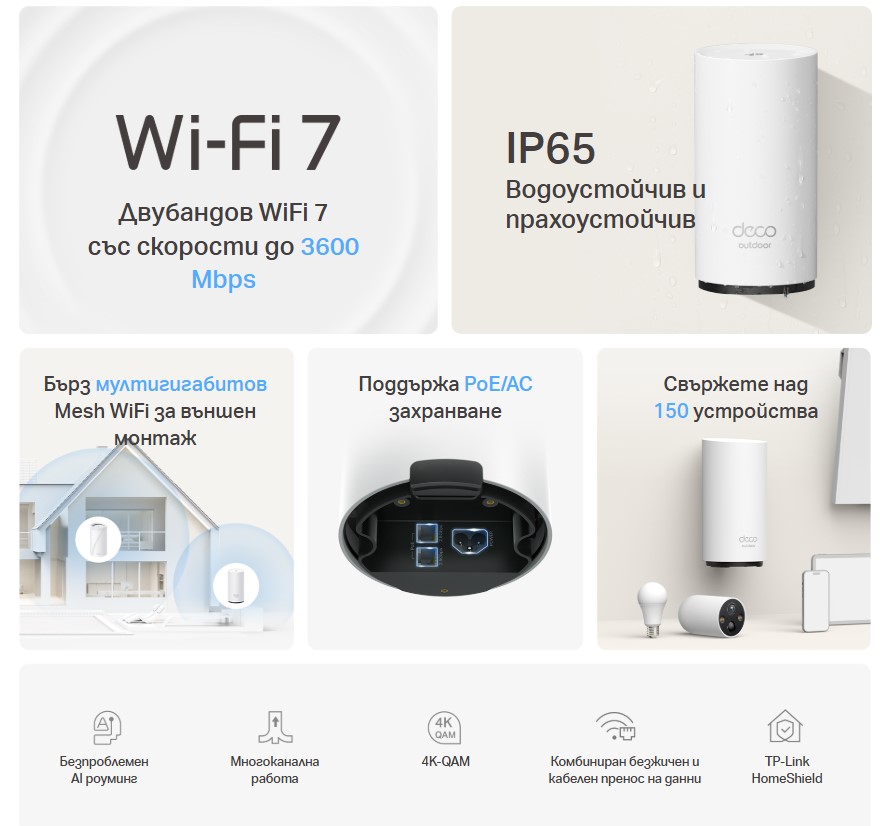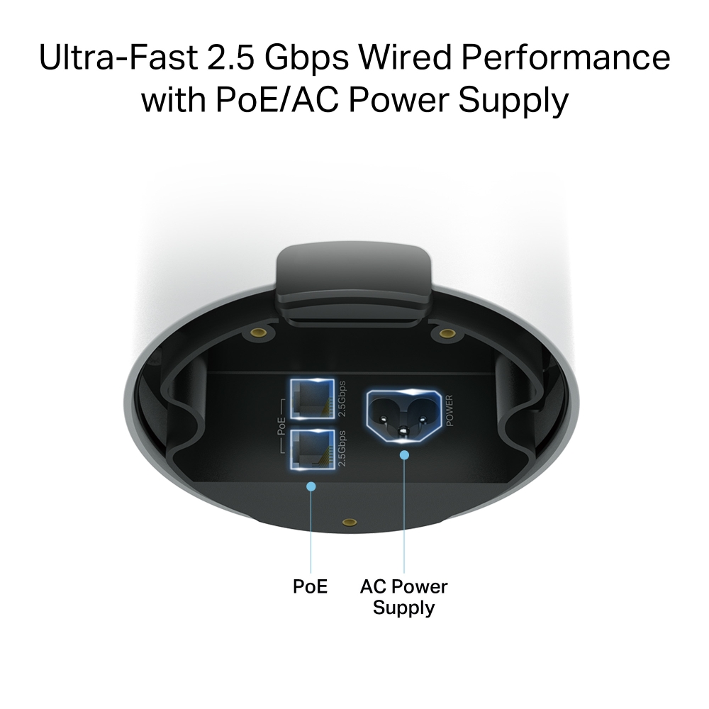 Deco BE25-Outdoor поддържа PoE (Power over Ethernet), както и AC захранване, което му позволява да работи в сложни външни среди. Два 2.5 Gbps порта с PoE ще ви помогнат да се отървете от допълнителни кабели и захранващи адаптери. Идеален за семейства и натоварени домакинства.