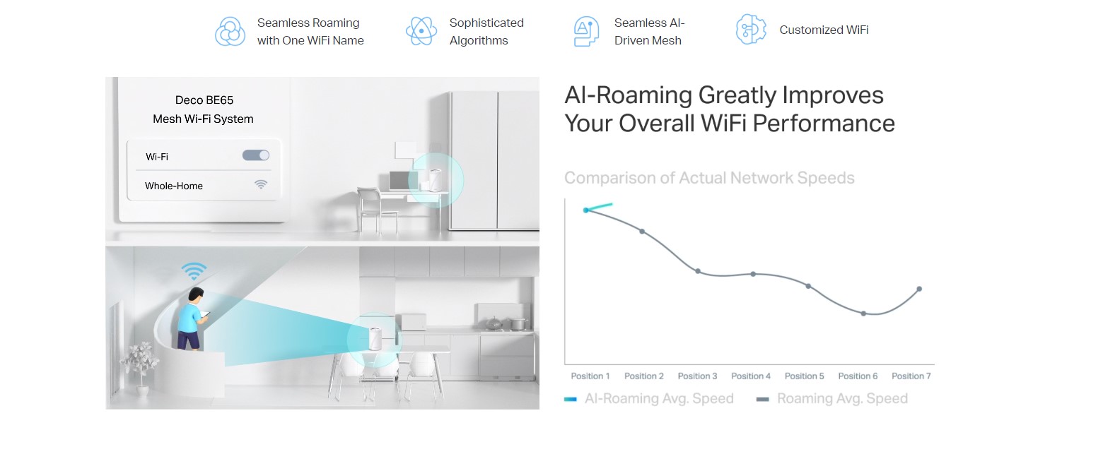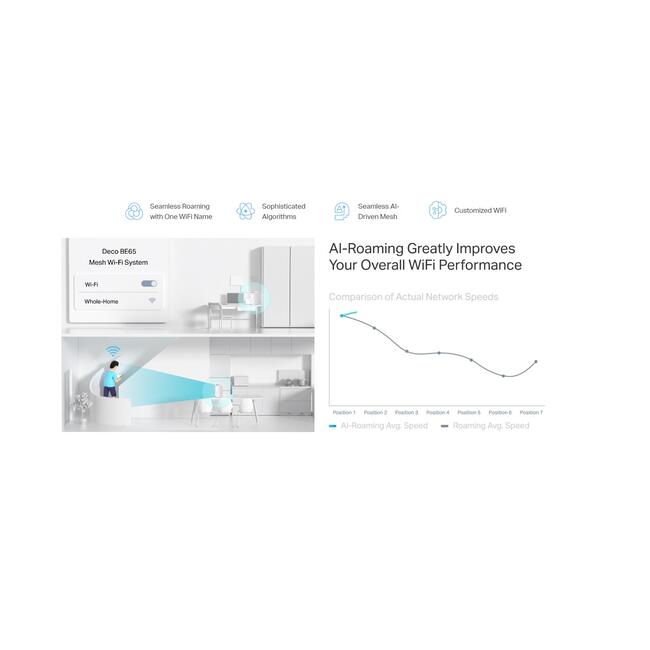 Deco Mesh образува унифицирана мрежа с едно име на мрежата. С вградената технология AI-Roaming, той създава идеалното WiFi решение със своите усъвършенствани алгоритми и самообучение. Разходете се из дома си и се насладете на безпроблемно поточно предаване с възможно най-бързите скорости.