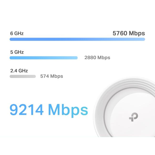 Wi-Fi 7 разгръща пълния потенциал на 4K-QAM и 6 GHz обхвата с до 320 MHz канали, осигурявайки безпрецедентни Wi-Fi скорости до 9214 Mbps. Новата честотна лента от 6 GHz осигурява канали с изключителна честотна лента без задръствания.