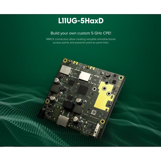 Спомняте ли си тръпката от създаването на вашите персонализирани решения с нашата серия RouterBoard? Подгответе се за още повече постижения „Направи си сам“: обновяваме продуктова линия RB с Wi-Fi 6! Подобно на надеждния RB911, нашият чисто нов L11UG-5HaxD ще бъде вашият най-добър приятел, когато става въпрос за изграждане на нискобюджетни външни CPE или AP! Тази малка платка разполага с модерен Qualcomm Maple процесор, базиран на ARM архитектура, 256 MB RAM, USB порт за допълнително съхранение или други нужди и Gigabit Ethernet порт с PoE-in.
