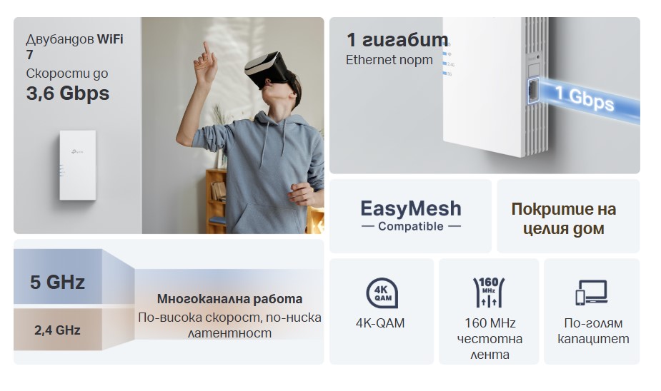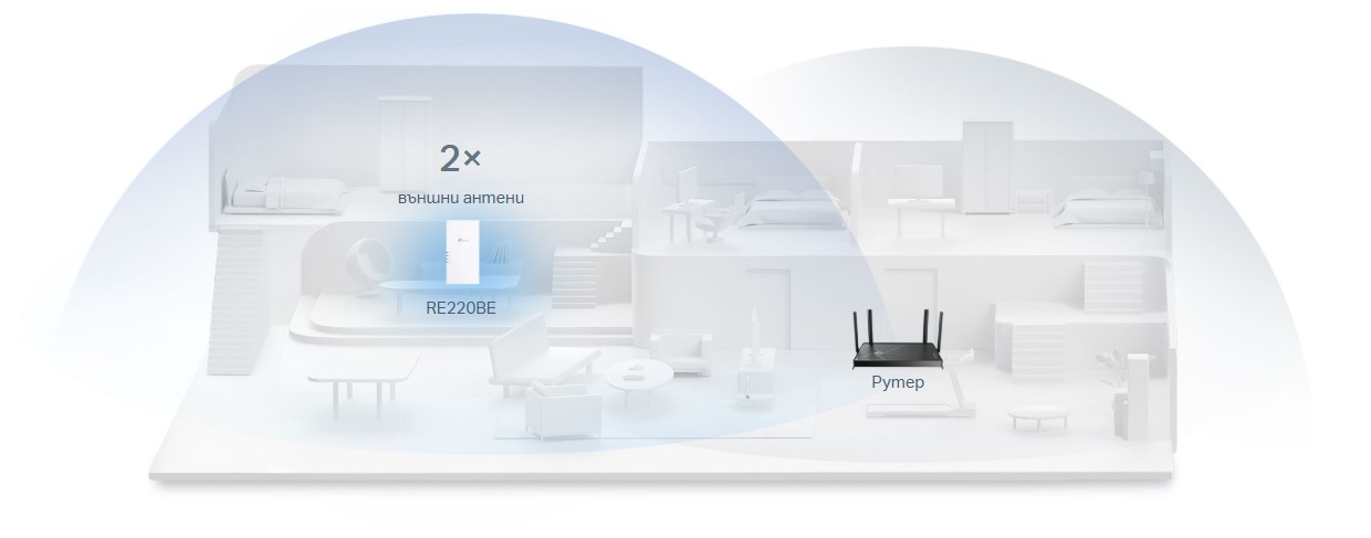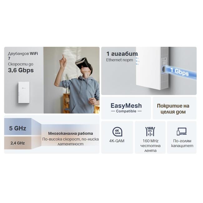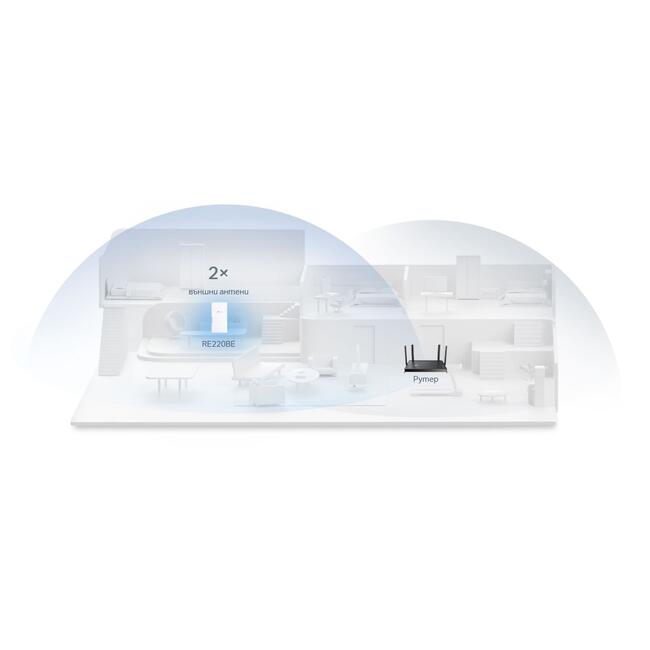 • Разширител на обхват Wi-Fi 7 RE220BE