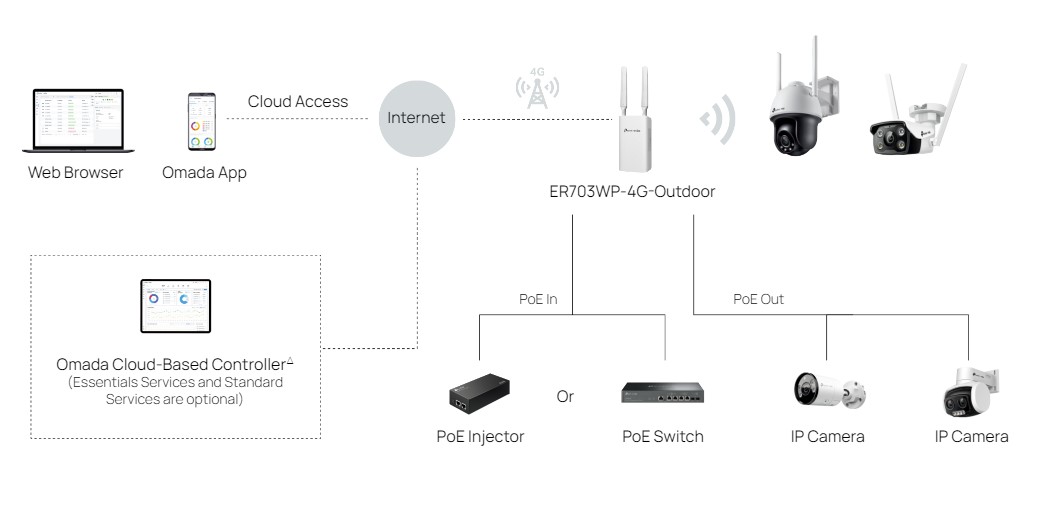 Позволява лесна настройка на мрежа в множество сайтове без изпращане на инженер за конфигурация на място. Дистанционно управление чрез приложението или уеб на Omada, предлагайки безплатно версията Essentials на облачни услуги, намалявайки разходите за поддръжка за MSP/SI.