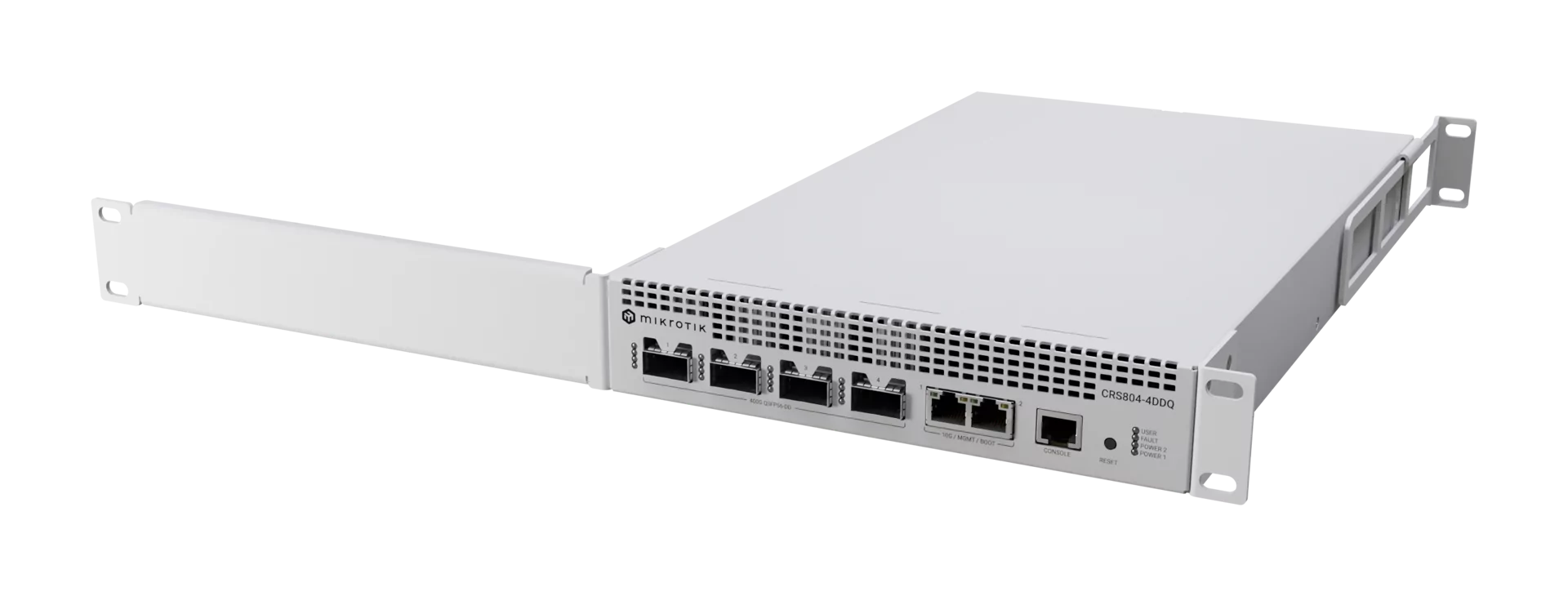 Компактен 1U 400G комутатор, проектиран за AI клъстери, сторидж мрежи и високоскоростна агрегация, оборудван с четири 400G QSFP56-DD порта, два 10 Gigabit Ethernet порта и RouterOS v7.