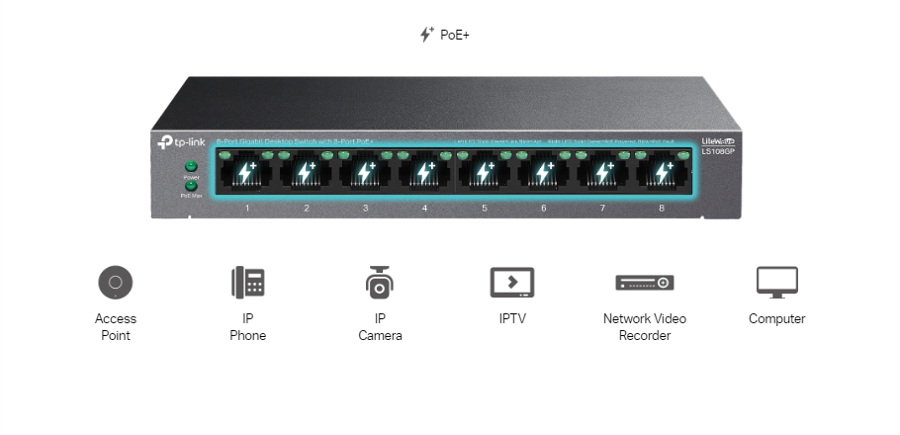 | Интерфейс | 8× 10/100/1000Mbps RJ45 Ports (Ports 1–8 supports 802.3af/at PoE+) |