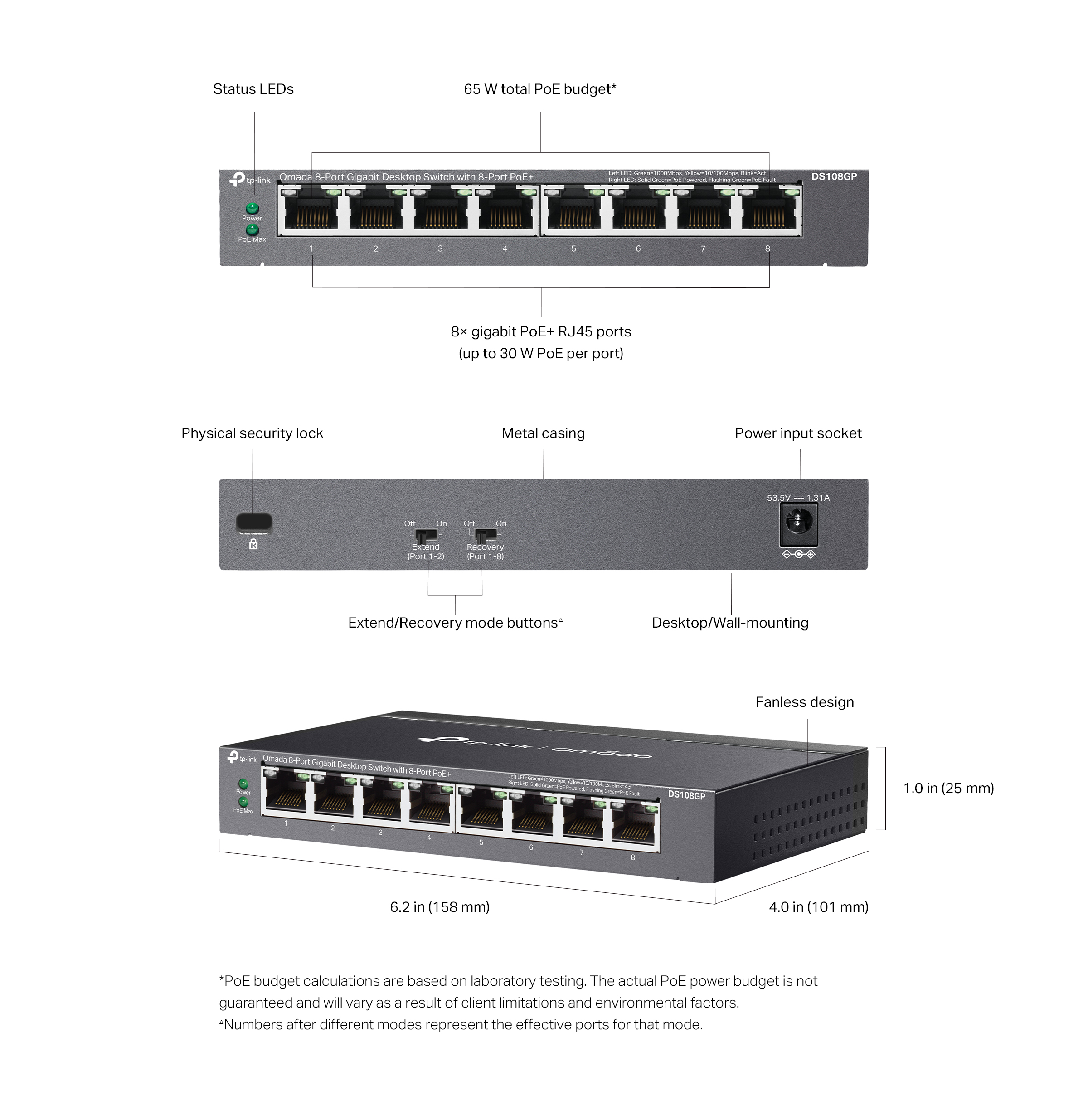 | Интерфейс | 8× 10/100/1000Mbps RJ45 Ports (Ports 1–8 supports 802.3af/at PoE+) |