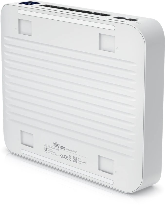 UniFi Switch Enterprise 8 PoE е надежден управляем 2,5-гигабитов L3 комутатор с комутационен капацитет от 80 Gbps, (8) 2,5-гигабитови LAN порта и два SFP+ (10 Gbps) слота. Всички Ethernet портове поддържат 802.3af/at PoE-Out с изходна мощност от 30 W/порт и общ PoE бюджет от 120 W. В допълнение към стандартното оборудване, комутаторът разполага и с 1,3" сензорен екран за предоставяне на информация за система, температура, статистика на портовете, PoE захранване и много други.Суичът може да се захранва чрез стандартно 230 V и максимална консумация на енергия е 150W.