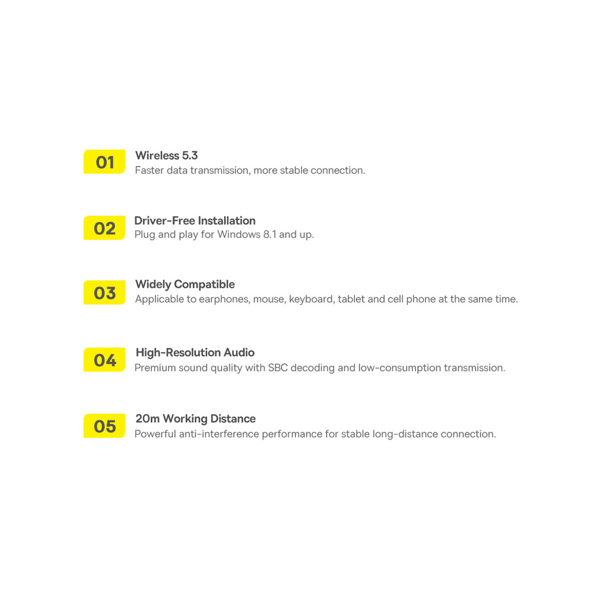 Безжичният адаптер Baseus осигурява по-бързо предаване на данни и стабилна връзка на разстояние до 20 м благодарение на своя 5.3 чип. Той поддържа Plug and Play и е широко съвместим с устройства, оборудвани с USB-A порт. Може да свързва до 5 устройства едновременно и предлага Hi-Fi звук с висока разделителна способност.