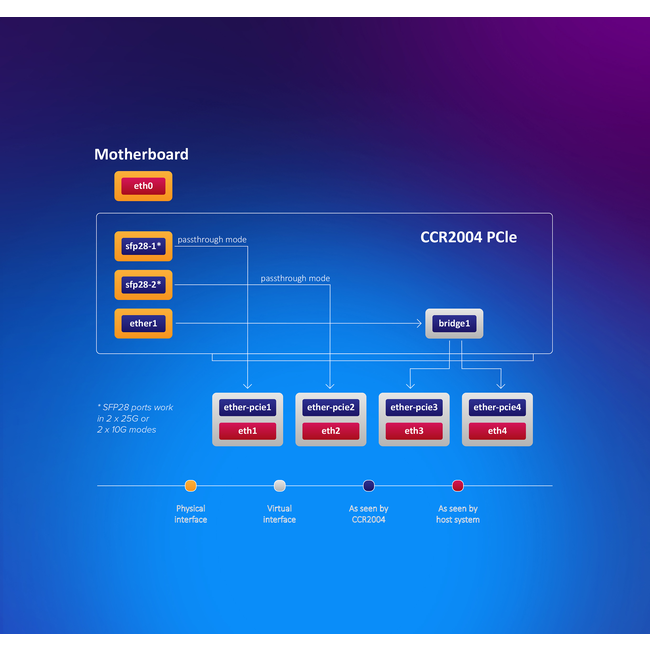 По подразбиране PCIe интерфейсът ще се показва като 4 виртуални Ethernet интерфейса. 2 за 25G SFP28 и 2 за - Ethernet-PCIe за достъп за управление.