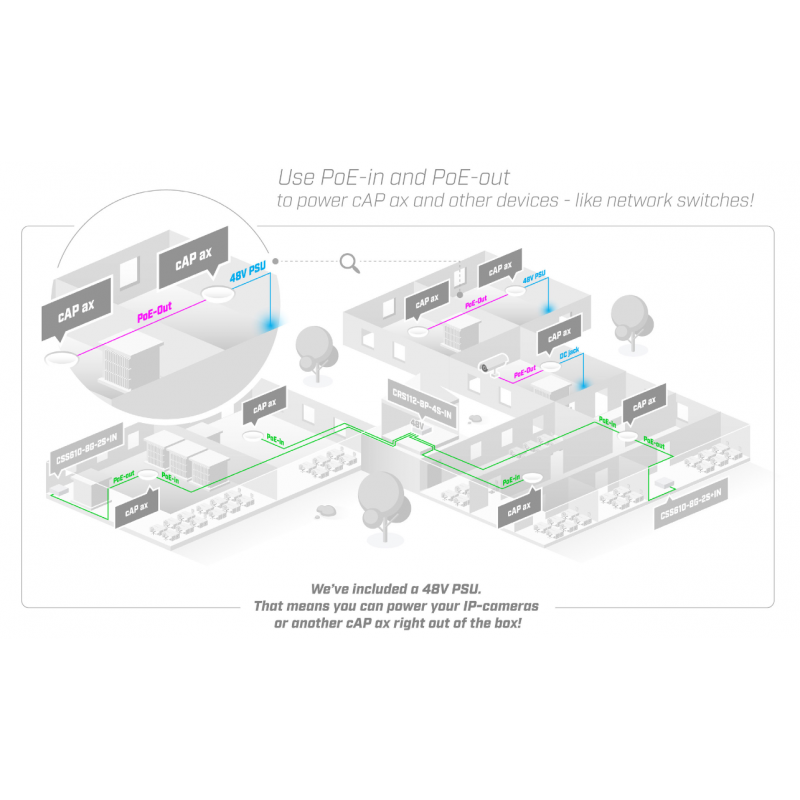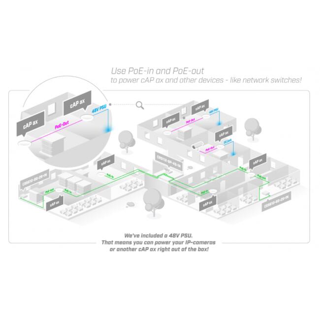 cAP axe също е чудесен начин да улесните инсталирането и поддръжката на вашата офис мрежа, тъй като разполага с PoE-in и PoE-out. Точно така – можете да използвате cAP ax за захранване на други устройства, като мрежови комутатори, камери за видеонаблюдение или дори друга cAP ax! И като говорим за лесни офис мрежи... Само няколко щраквания в нашата най-нова система за централно управление wifiwave2 CAPsMAN - и сте готови с настройката на стотици cAP ax устройства! Можете да използвате всички видове устройства MikroTik, за да стартирате CAPsMAN без усилие.