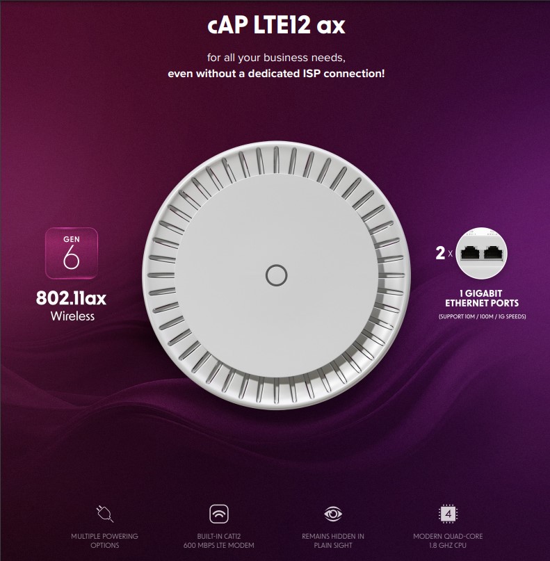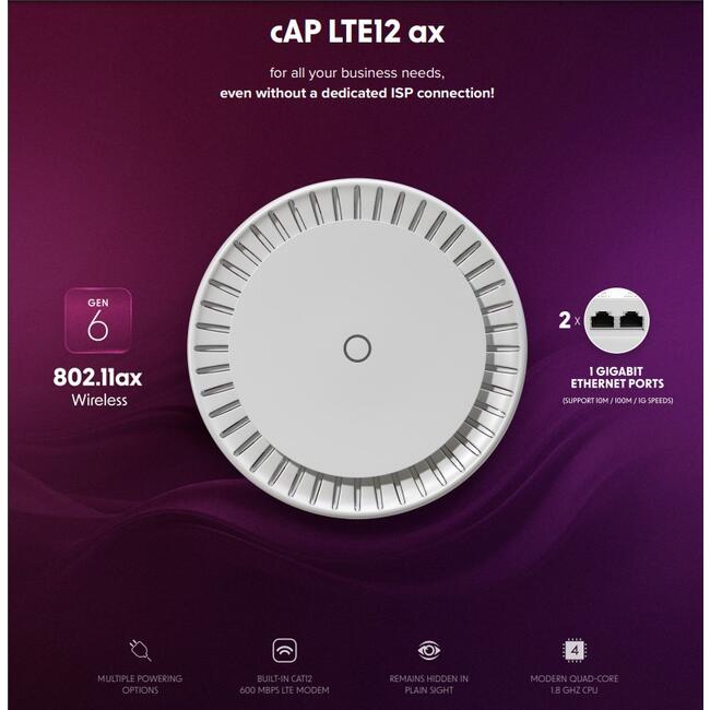 С мощен quad-core ARM CPU на 1.8 GHz, 1 GB RAM и гъвкавата RouterOS v7, cAP LTE12 ax е много повече от обикновена точка за достъп. Той предлага широка гама от усъвършенствани функции, включително: