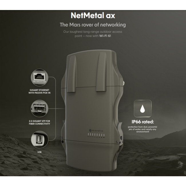 Мощното двулентово, двуканално Wi-Fi 6 радио предлага увеличена скорост, стабилност, сигурност, роуминг, управление на мощността и други функции в сравнение с предишните безжични протоколи. Двата RP-SMA конектора позволяват добавянето на антена по ваш избор за разстояния до 30 километра.* Ако е необходимо, можете да адаптирате NetMetal ax за употреба на по-къси разстояния с антени като нашата HGO-antenna-OUT завинтваща всепосочна антена. Тя осигурява 3.3 dBi усилване за 2.4 GHz диапазона и 5.5-7.1 dBi усилване за 5 GHz диапазона.