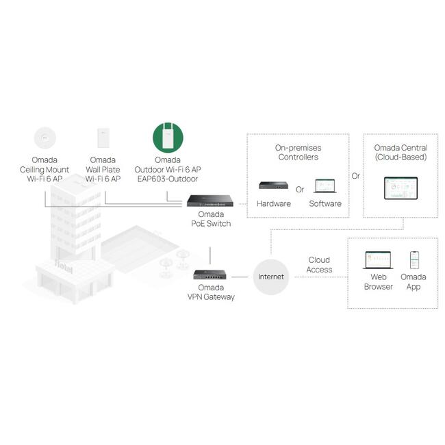 Omada Software-Defined Networking (SDN) решение безпроблемно интегрира точки за достъп (APs), управлявани суичове и gateways, осигурявайки 100% централизирано cloud управление за силно скалируема мрежа.