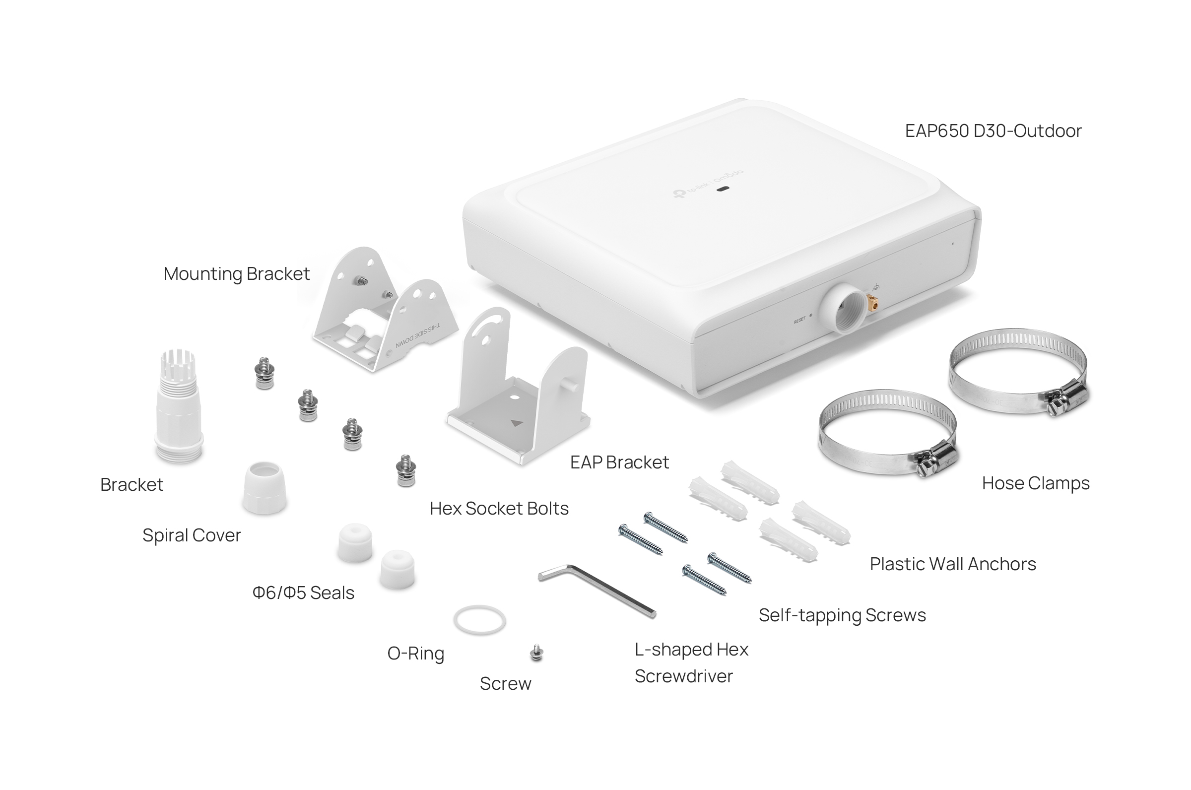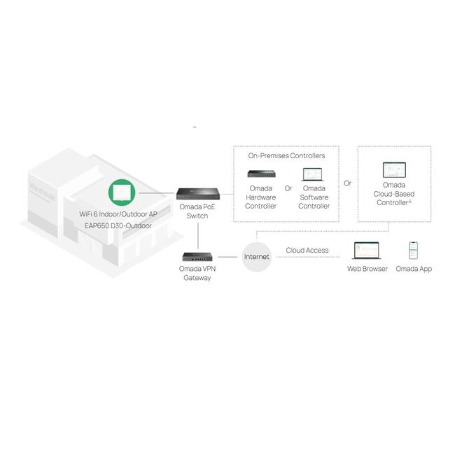 На базата на полеви тестове в открита, открита и неограничена среда. Посоченото разстояние тук е максималното разстояние за един EAP650 D30-Outdoor, при което силата на сигнала на клиента е ≥ -75 dBm. Реалният обхват на предаване и препоръчителното покритие може да варира в зависимост от околната среда, получаващото устройство и други фактори.