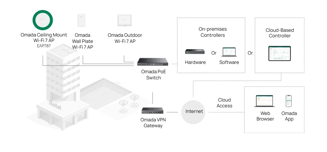 Решението за софтуерно дефинирани мрежи (SDN) на Omada безпроблемно интегрира точки за достъп (AP), управлявани комутатори и Gateway, позволявайки 100% централизирано управление на облака за силно мащабируема мрежа.
