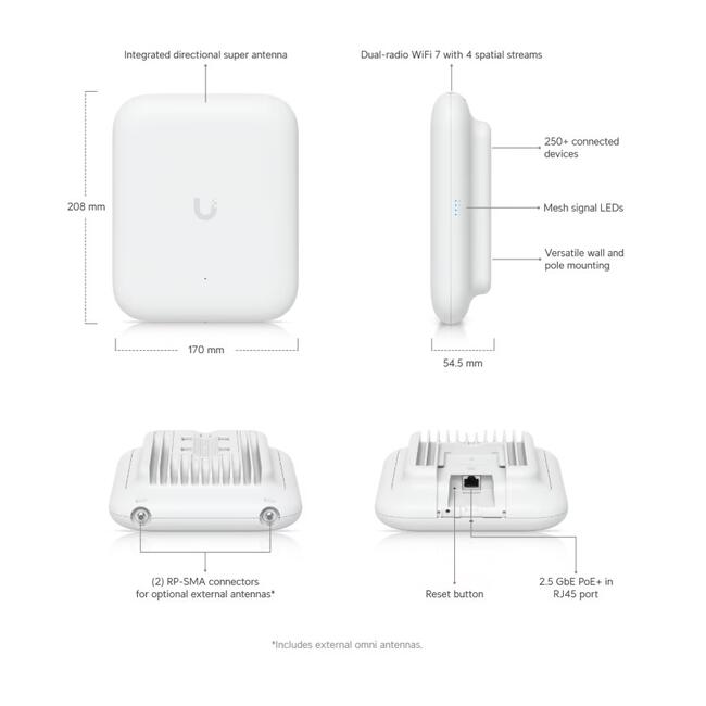 Всесезонна WiFi 7 точка за достъп с 4 пространствени потока, вградена насочена супер антена и разнообразни възможности за монтаж.