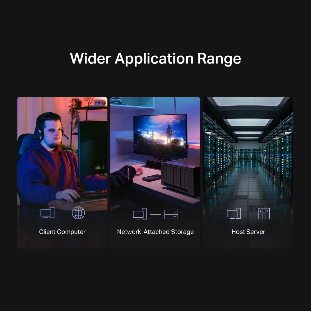 MA510E максимизира 10 Gbps интернет достъп, безпроблемно се свързва с NAS устройства за високоскоростно предаване на данни или се свързва с хост сървър за подобрена хардуерна производителност.